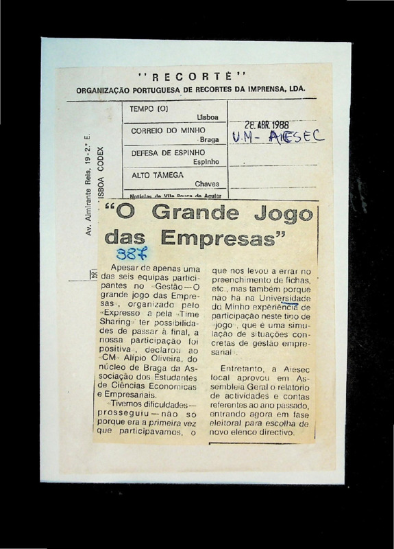A Associação de Estudantes de Ciências Económicas e Empresariais do núcleo de Braga da Universidade do Minho participou no concurso “Gestão — O grande jogo das Empresas”, organizado pelo jornal Expresso e pela Time Sharing. Apesar de não ter passado à final, Alípio Oliveira, membro da associação, considerou a experiência positiva e destacou a falta de prática na simulação de gestão empresarial. A associação aprovou também o relatório de atividades e contas do ano anterior e iniciou processo eleitoral para nova direção.